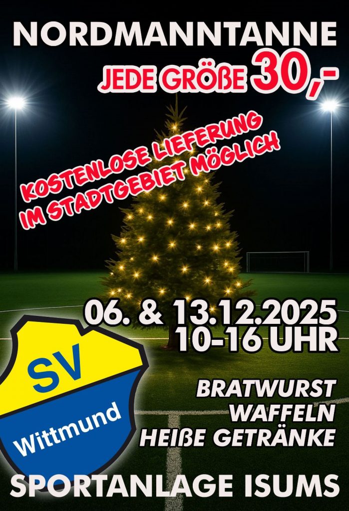 Auch in diesem Jahr könnt ihr euren Weihnachtsbaum bei uns kaufen. Dabei unterstützt ihr unsere Vereinsarbeit in allen Bereichen – von klein bis groß. Wir machen euch wieder einen gemütlichen Samstag mit Heißgetränken, Bratwurst und leckeren Waffeln. Kommt vorbei! Wenn ihr wollt, liefern wir den Baum auch im Stadtgebiet. Sprecht uns einfach an!